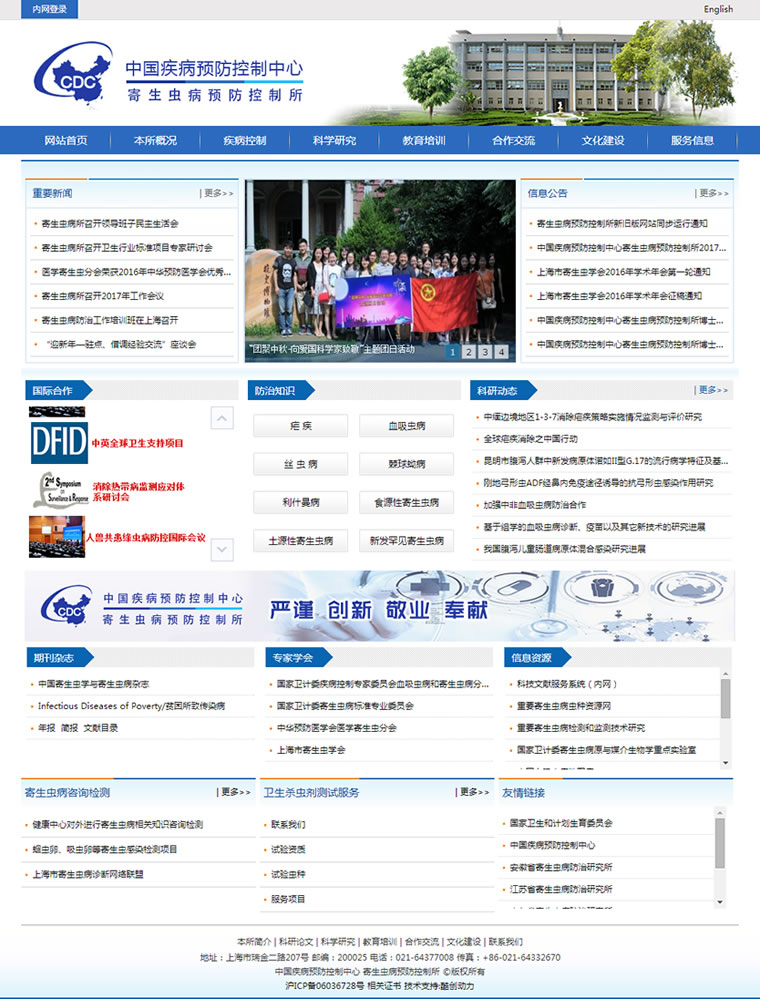 中國疾病預防控制中心寄生蟲病預防控制所,前身為中央衛(wèi)生研究院華東分院,1950年建于南京,1956年定名為中國醫(yī)學科學院寄生蟲病研究所,1957年與中國醫(yī)學科學院海南瘧疾研究站合并,遷址上海,1983年劃歸中國預防醫(yī)學科學院領導。2002年1月23日更名組建為中國疾病預防控制中心寄生蟲病預防控制所。